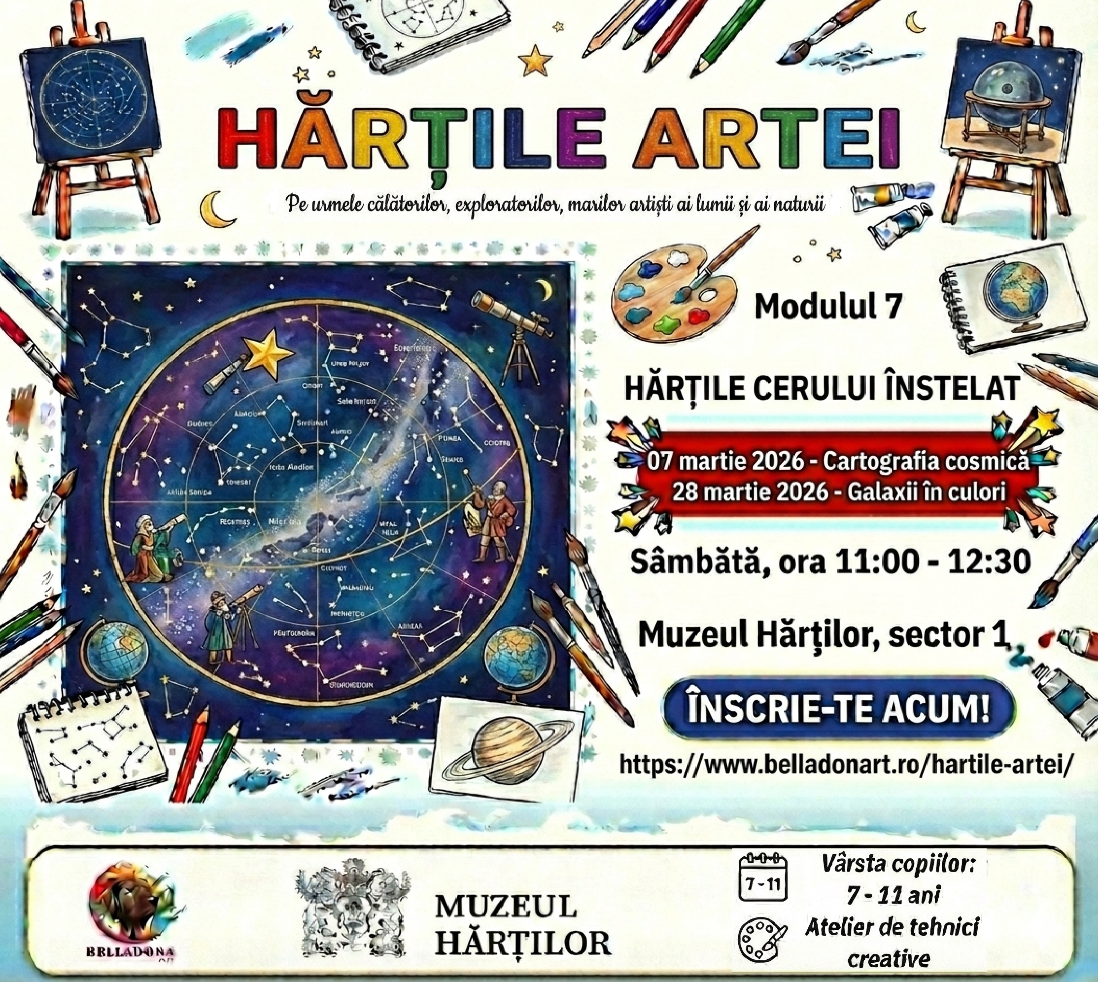 Muzeul Hărților în parteneriat cu Atelier Belladona Art organizează programul educativ Hărțile artei. Copiii cu vârsta cuprinsă între 7 și 11 ani sunt invitați să participe în luna martie la modulul 7 - Hărțile cerului înstelat. Atelierele prezintă aspecte importante ale dezvoltării civilizațiilor lumii, vom studia și vom descoperi împreună evoluția, semnificațiile și rolul hărților prin intermediul artelor plastice și grafice. Experiența vizitei în sălile fascinante ale Muzeului Hărților este î [...]