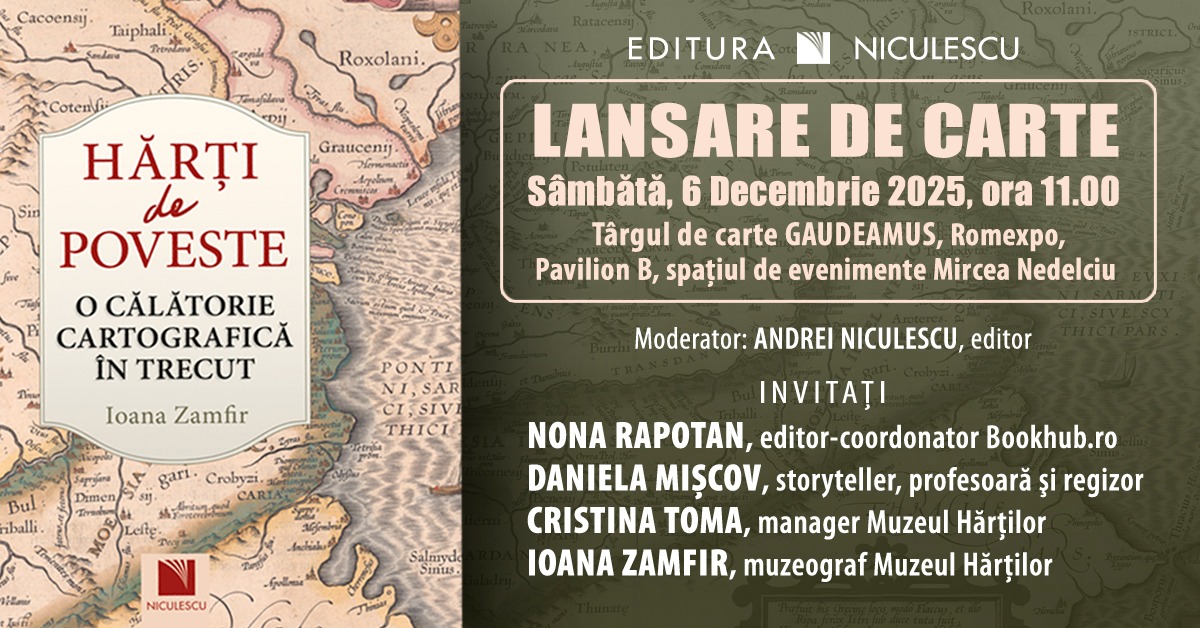Sâmbătă, 6 decembrie, de la ora 11:00, vă invităm în spațiul de evenimente „Mircea Nedelciu” de la Târgul de Carte Gaudeamus (Romexpo, Pavilion B) pentru lansarea volumului Hărți de poveste. O călătorie cartografică în trecut, semnată de muzeografa Ioana Zamfir.