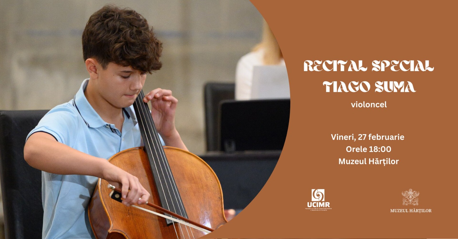 Vineri, 27 februarie 2026, de la ora 18:00, Muzeul Hărților și Uniunea de Creație Interpretativă a Muzicienilor din România vă invită la un recital special de violoncel, susținut de Tiago Suma. Pentru tânărul de doar 13 ani, violoncelul este mai mult decât un instrument, este o cale de a aduce muzica mai aproape de oameni.