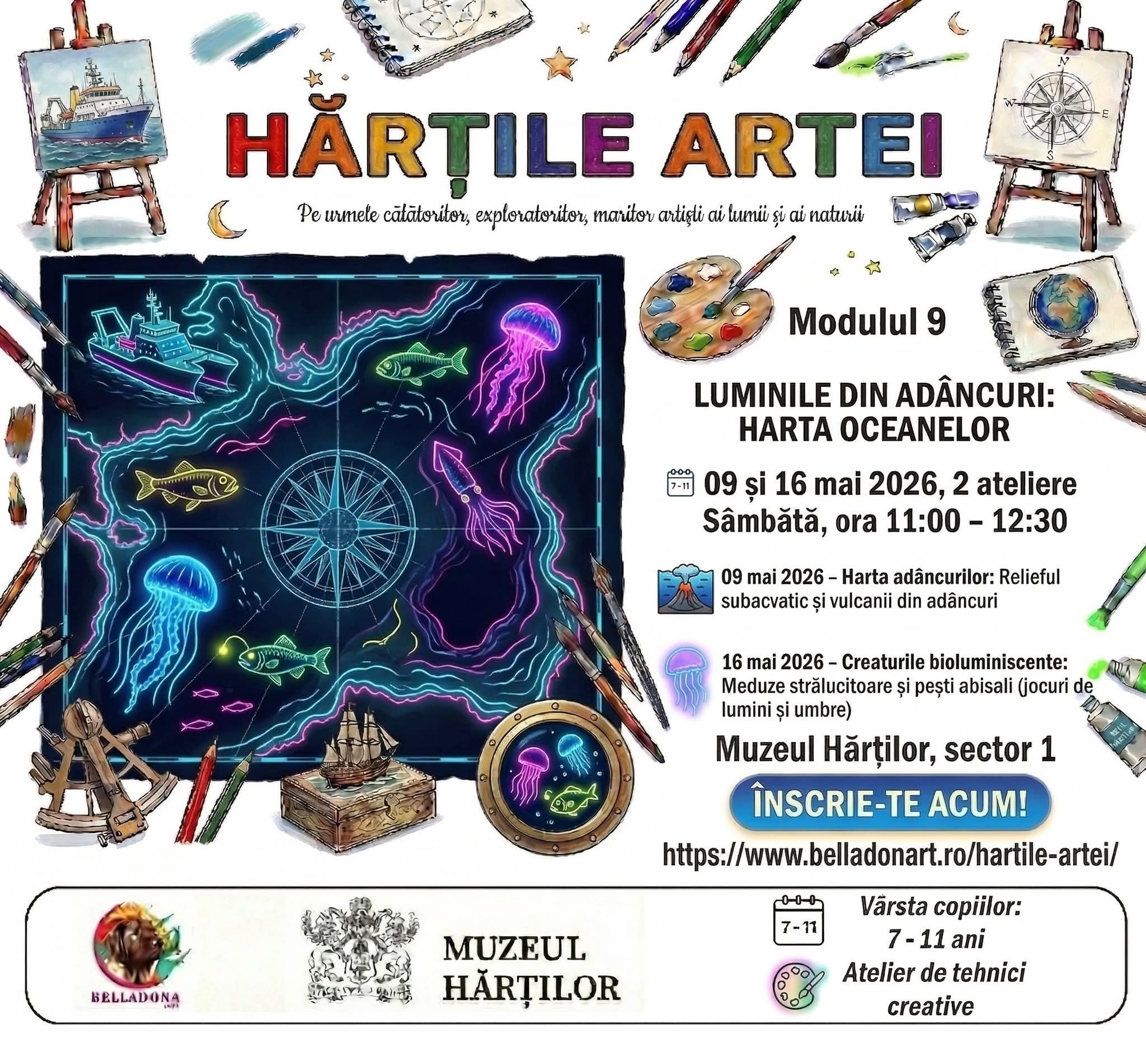 Muzeul Hărților în parteneriat cu Atelier Belladona Art organizează programul educativ Hărțile artei. Copiii cu vârsta cuprinsă între 7 și 11 ani sunt invitați să participe în luna mai la modulul 9 - Luminile din adâncuri: Harta oceanelor. Atelierele prezintă aspecte importante ale dezvoltării civilizațiilor lumii, vom studia și vom descoperi împreună evoluția, semnificațiile și rolul hărților prin intermediul artelor plastice și grafice. Experiența vizitei în sălile fascinante ale Muzeului Hărț [...]
