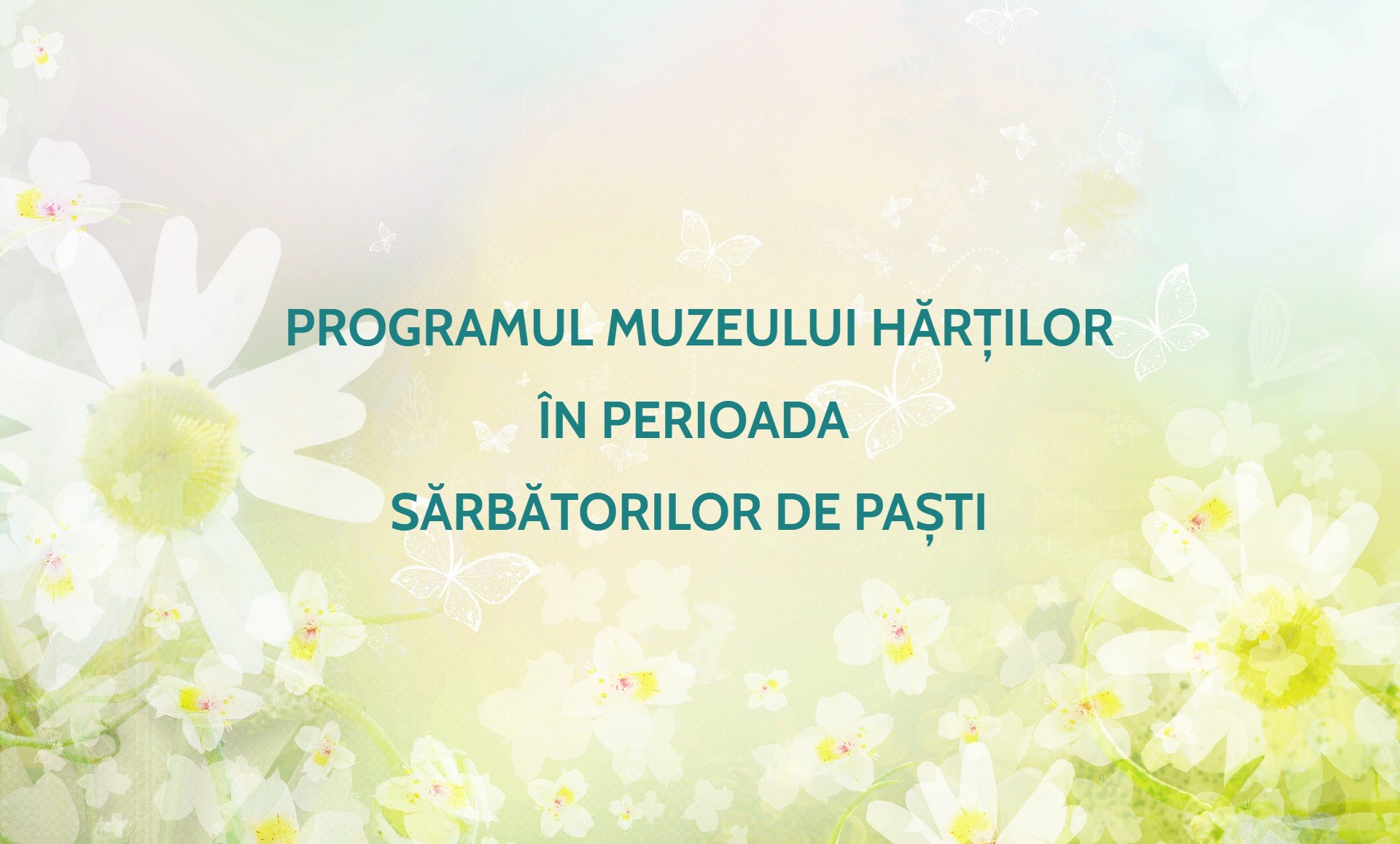 În perioada Sărbătorilor de Paşti, programul Muzeului Hărţilor este următorul: Vineri 10 aprilie 2026: Închis Sâmbătă 11 aprilie 2026: Deschis în intervalul orar 10:00 – 14:00 Duminică 12 aprilie, luni 13 aprilie, marţi 14 aprilie 2026: Închis De miercuri, 15 aprilie 2026, se reia programul obișnuit de vizitare, între orele 10:00 – 18:00. Dorim prietenilor și vizitatorilor noştri Paște fericit, cu sănătate și speranță!