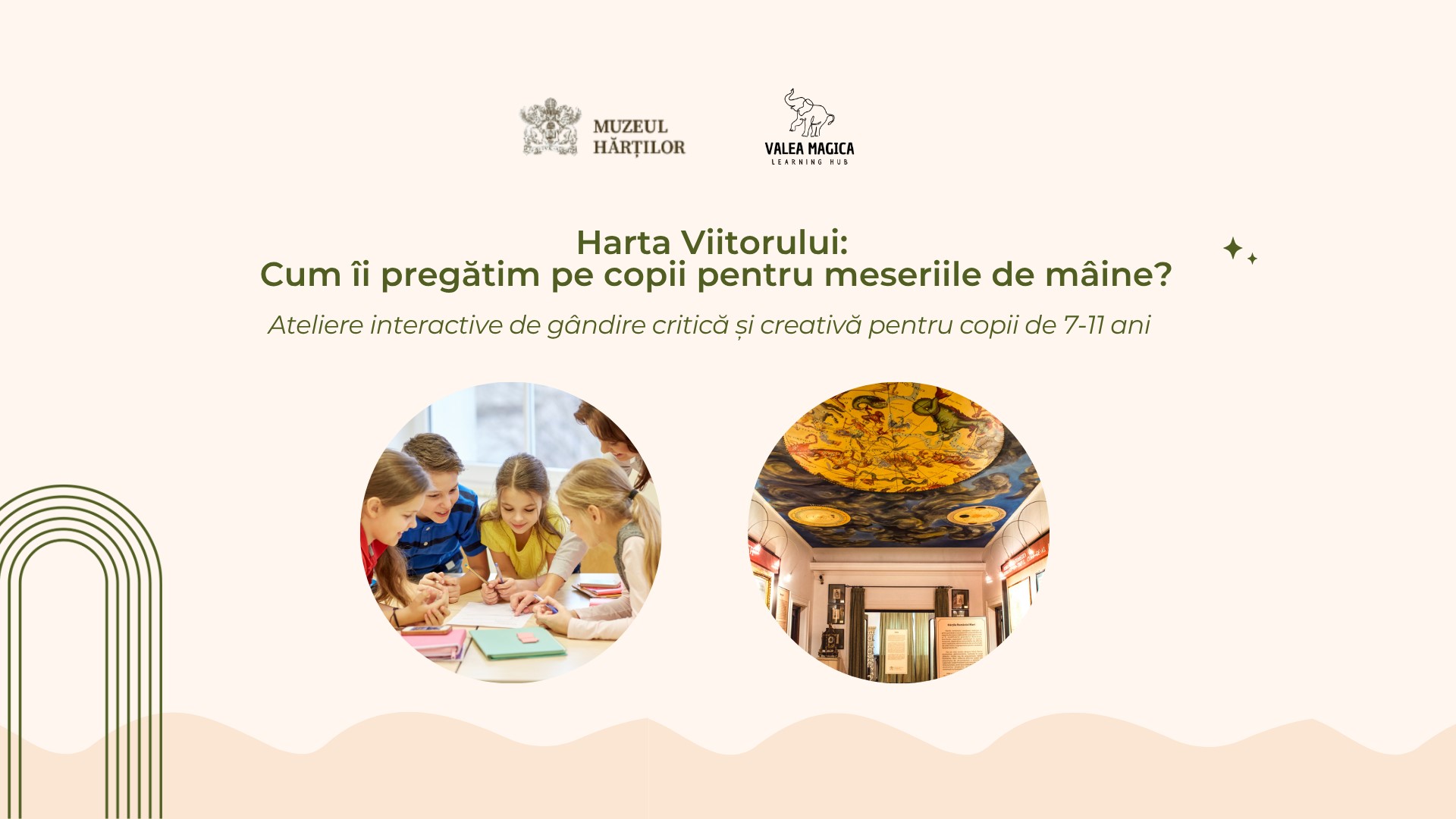 Muzeul Hărților și Valea Magică invită grupurile de copii din clasele primare să participe la atelierele de gândire critică și creativitate din seria Harta Viitorului: Cum îi pregătim pe copii pentru meseriile de mâine? Dacă ești un profesor sau părinte preocupat de viitorul copiilor într-o lume incertă, te invităm la Muzeu unde vom aborda o meserie nouă în fiecare lună. Copiii vor învăța într-un mod practic și interactiv cum să pună întrebările potrivite și să rezolve probleme specifice unei me [...]